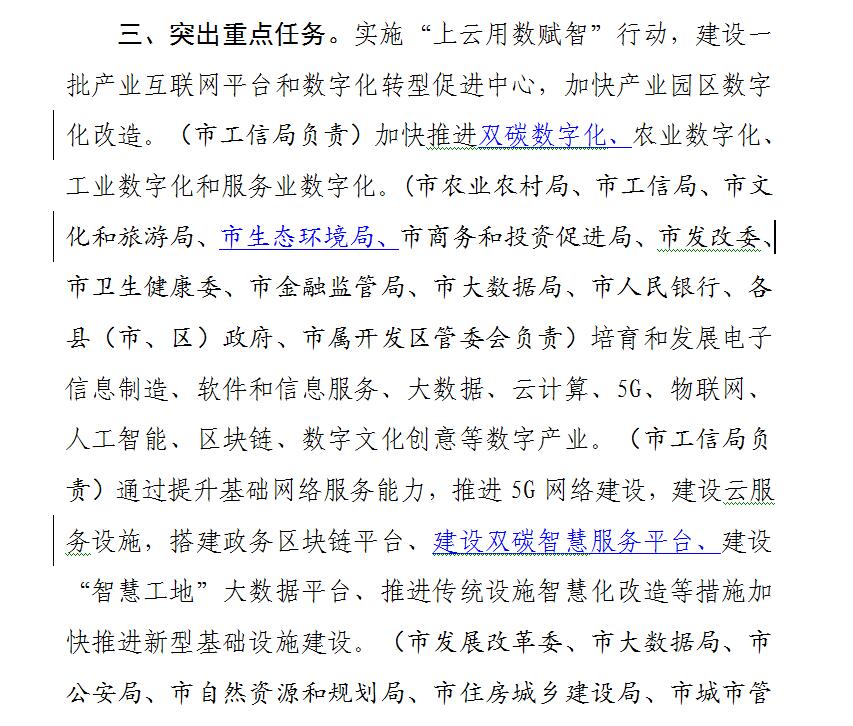 三、突出重点任务。实施“上云用数赋智”行动,建设一批产业互联网平台和数字化转型促进中心,加快产业园区数字化改造。(市工信局负责)加快推进农业数字化、工业数字化和服务业数字化。(市农业农村局、市工信局、市文化和旅游局、市商务和投资促进局、市发改委、市卫生健康委、市金融监管局、市大数据局、市人民银行、各县(市、区)政府、市属开发区管委会负责)培育和发展电子信息制造、软件和信息服务、大数据、云计算、5G、物联网、人工智能、区块链、数字文化创意等数字产业。(市工信局负责)通过提升基础网络服务能力,推进5G网络建设,建设云服务设施,搭建政务区块链平台、建设“智慧工地”大数据平台、推进传统设施智慧化改造等措施加快推进新型基础设施建设。(市发展改革委、市大数据局、市公安局、市自然资源和规划局、市住房城乡建设局、市城市管理局、市工业和信息化局、中国铁塔网赌的十大网站老品牌网站分公司负责)通过提升数字基础支撑水平和推动数据共享开放,加快完善政府数据资源标准体系,提高政务数据开放共享的规范化和标准化水平。(市大数据负责)推动社会治理精准化、健全数字化公共服务体系,聚焦教育、医疗、交通、金融等重点领域供给数字化,不断提升基本公共服务均等化、普惠化、便捷化水平。(市大数据局负责)